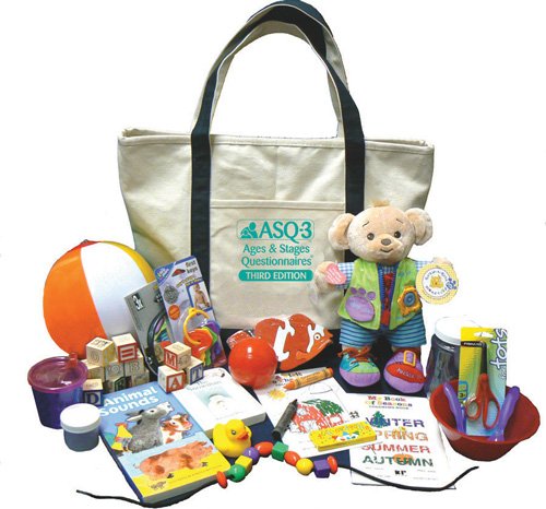 The ASQ-3 Materials Kit comes with a helpful booklet on how to use the kit with the questionnaires and a sturdy tote bag (extras are available separately) with zipper closure for convenient storage and travel.
